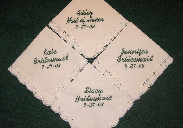 These Bridal party gift handkerchiefs make wonderful personalized gifts for moms and grandmothers. A loving way to take care of the tears that shall certainly fall on your wedding day. They are also a nice memento of first communions. Beautiful with a monogram. Give your attendants a wonderful memento of your wedding day.