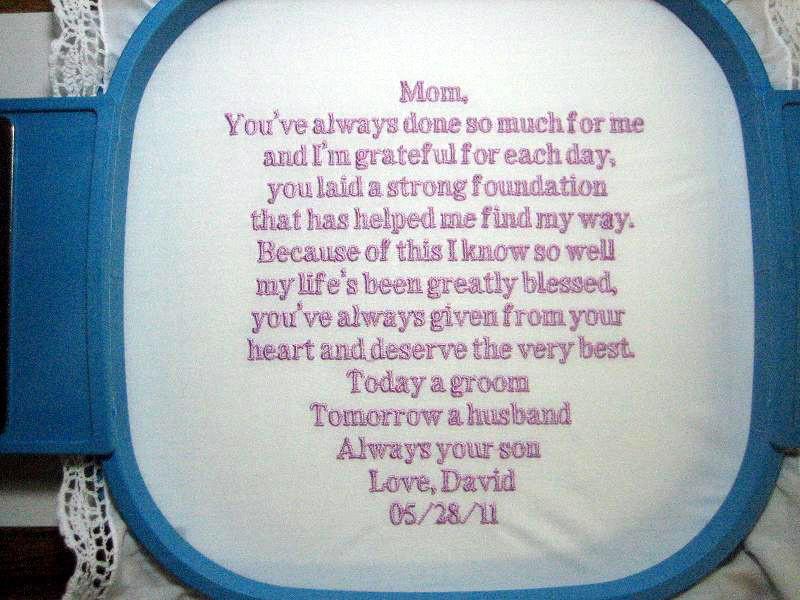 This wedding handkerchief expresses your heartfelt feelings to his mother. It will be greatly treasured by his Mom, and dry her tears during the wedding. The sentimental poem fills the entire hanky.Maximum of 50 words. Ask for quote for more words.