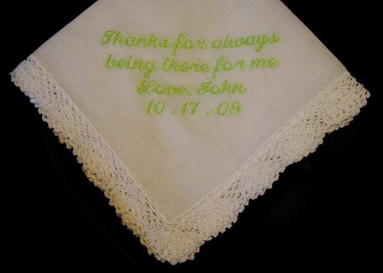 Beautiful personalized handkerchief makes a nice memento for the mother of the groom.