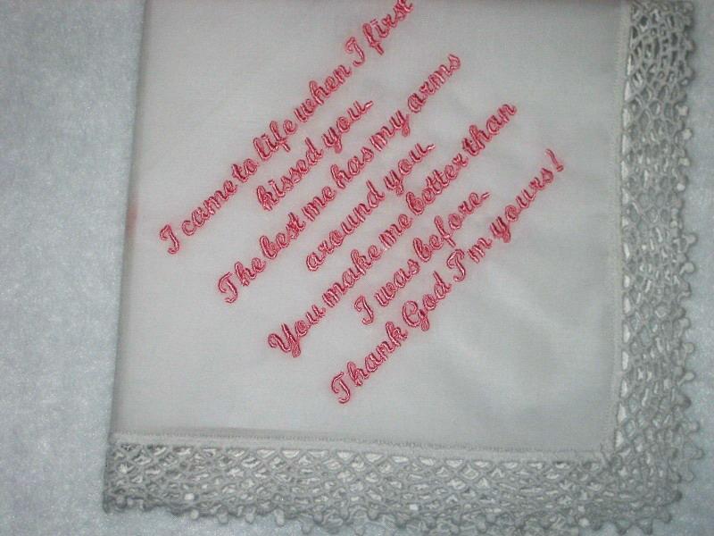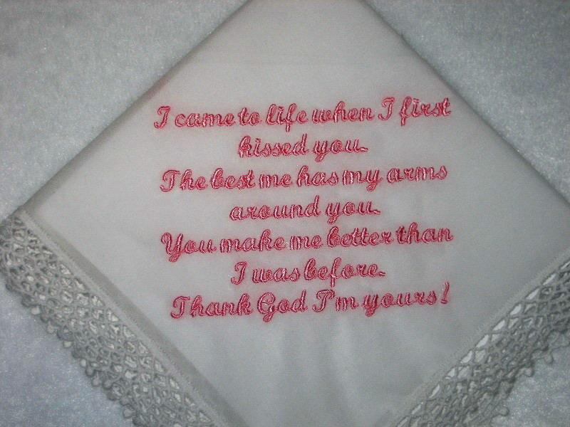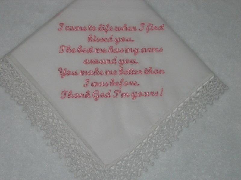 Wedding handkerchief from the groom to his bride to tell her that she is meant for you. Customized and personalized to be given on your wedding day or before. A brides hankie that she will cherish always.