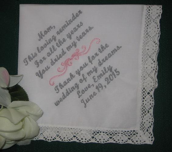 This delicate handkerchief is 13″ square with a beautiful lace around its periphery. The scroll work in the center accentuates your feelings and love for your mom. She will treasure this memento forever.