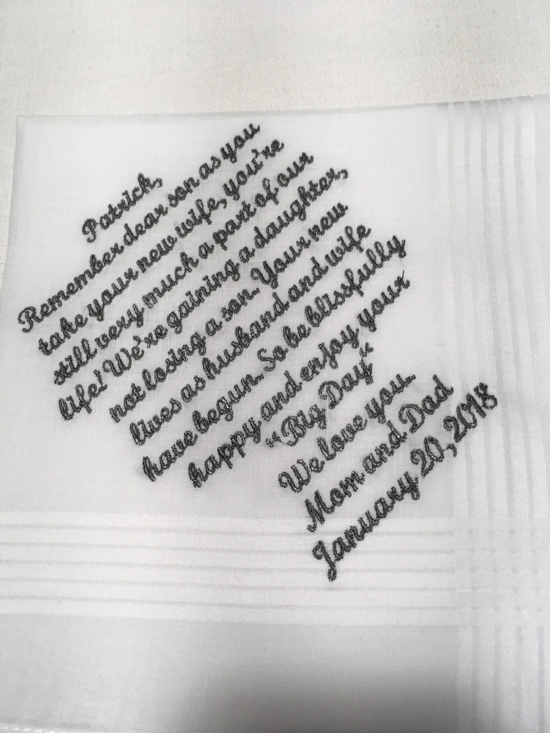 Personalize it with your son’s name and the date of the wedding, and choose the thread color that best represents your love for him. You can also customize the wording to express your heartfelt wishes in the ‘note to seller’ section during checkout.