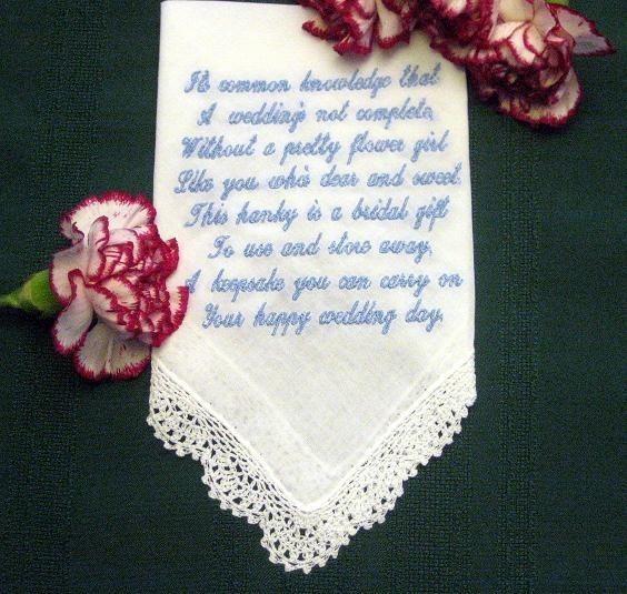 This hankie will be treasured for years to come. A perfect memento of your wedding for your flower girl to have for her own wedding. It’s made of cotton and lace. 13in. square.