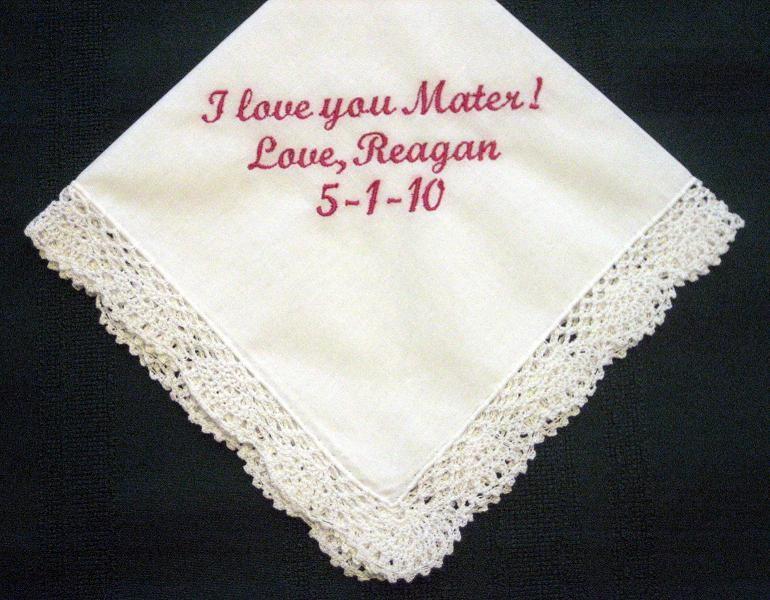 Give your mom or your groom’s mom a personalized wedding handkerchief.